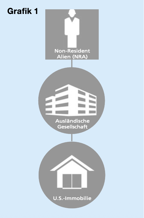 Wenn der in der Schweiz wohnhafte NRA als Eigentümer die U.S.-Immobilie in seinem eigenen Namen gekauft hat und auch zum Todes- oder Schenkungszeitpunkt Eigentümer gewesen ist, kann die unentgeltliche Zuwendung einer empfindlichen U.S. Erbschafts- oder Schenkungssteuer unterliegen. Aus diesem Grund werden grössere Immobilien oft über Strukturen erworben. Wenn der in der Schweiz wohnhafte NRA die Immobilie von einer ausländischen, nicht in den USA inkorporierten Gesellschaft hat kaufen lassen, die in seinem Besitz ist, wäre er bzw. seine Erben zum Schenkungs- oder Todeszeitpunkt vor der U.S. Erbschafts- oder Schenkungssteuer geschützt (siehe Grafik 1).