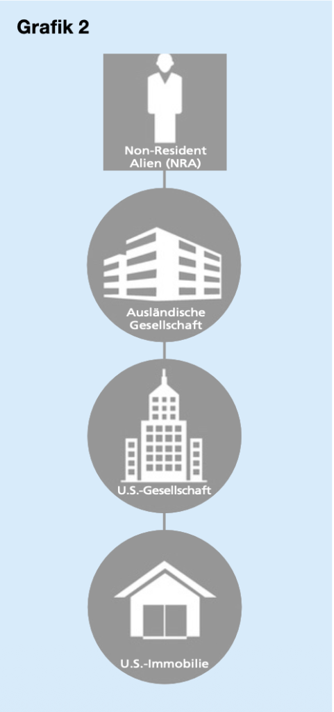 Weil eine U.S.-Gesellschaft jedoch nicht vor der U.S. Erbschafts- oder Schenkungssteuer schützt, müsste der in der Schweiz wohnhafte NRA zwischen sich und seiner U.S.-Immo-bilie zwei Gesellschaften einschieben, so dass die U.S.-Immobilie von einer U.S.-Gesellschaft gehalten wird, die ihrerseits als Tochtergesellschaft einer ausländischen Gesellschaft ausgestaltet ist (siehe Grafik 2).